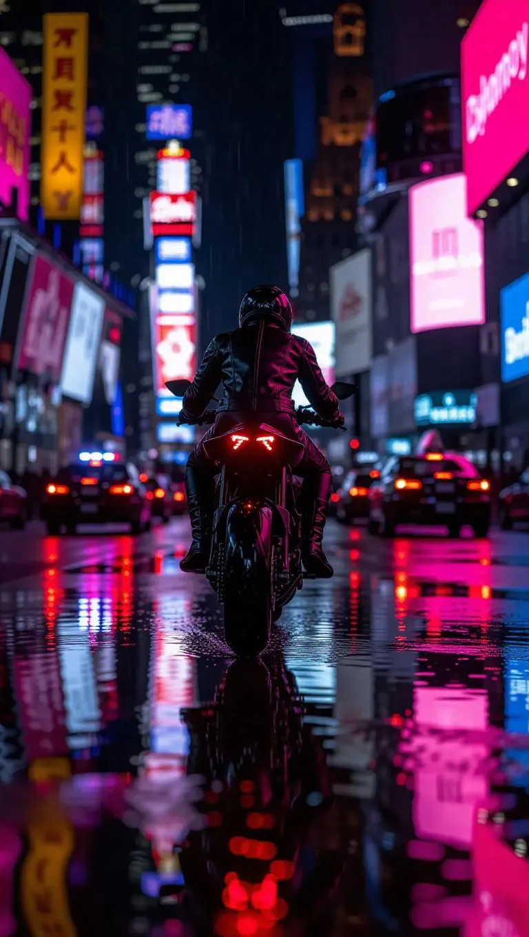 A bold motorcyclist in a silver leather jacket speeds down a rain-slicked boulevard, backlit by exploding streetlights and flickering billboard chaos. Digital reflections shimmer across puddles, and behind him, a chain of patrol cars twist through city hues. Motion-capture angle from below, sparks trailing from the tailpipe, dramatic shallow depth of field.