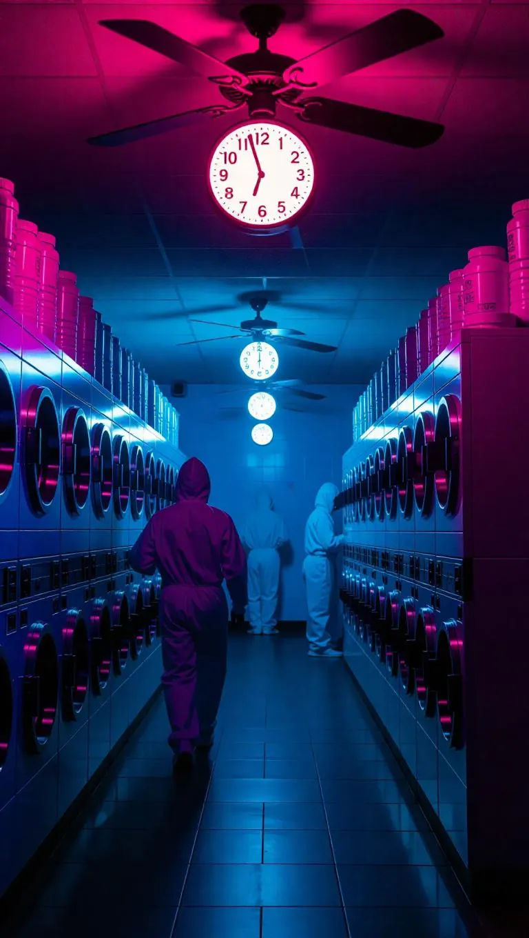 A drug lab hidden beneath a laundromat glows with ultraviolet light, shelves filled with jars, as figures in protective attire hurry to destroy evidence before a raid. Ceiling fans cast eerie rotating shadows across a large digital clock. Tense neon-dystopia interior with worn texture.