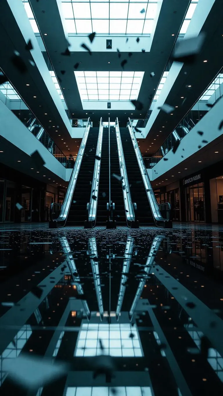 A tense gunfight erupts in an abandoned shopping mall, with shattered glass and broken escalators amplifying the chaos. The scene is framed in a cold, desaturated tone, emphasizing eerie, empty spaces and the echoes of gunfire.