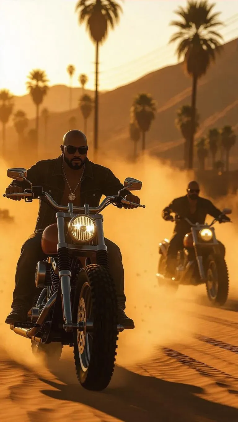 The desert outskirts of San Andreas, a dramatic backdrop for an epic showdown. CJ, riding a stylish chopper, engages in a intense shootout with a rival gang on ATVs. Dust clouds swirl around them, the setting sun casting long shadows and bright yellow hues, enhancing the raw tension and visual spectacle.