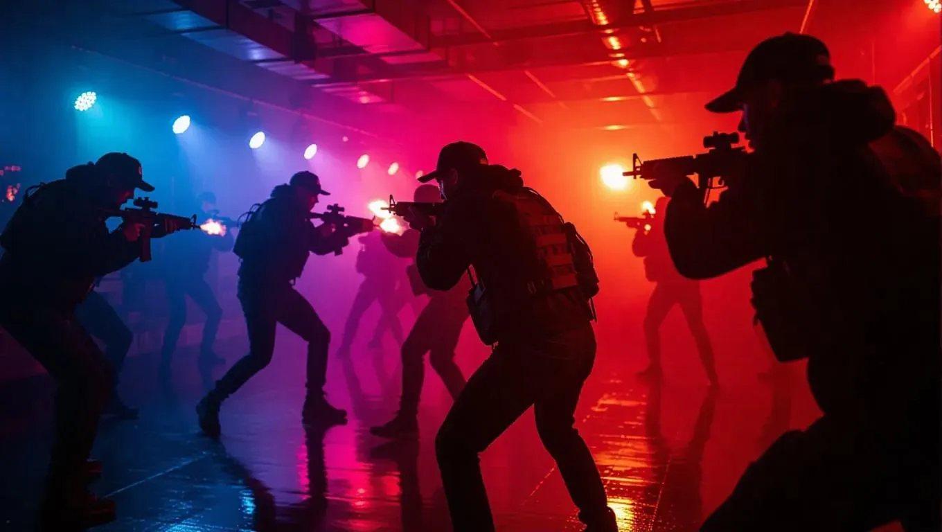 A gang ambushes a rival crew in a shadowy underground club, their weapons glinting in the flickering light, echoes reverberating off the speakers. A bass drop shakes the walls, adding to the tension. The scene is captured with a gritty, urban aesthetic, emphasizing the raw energy and danger.