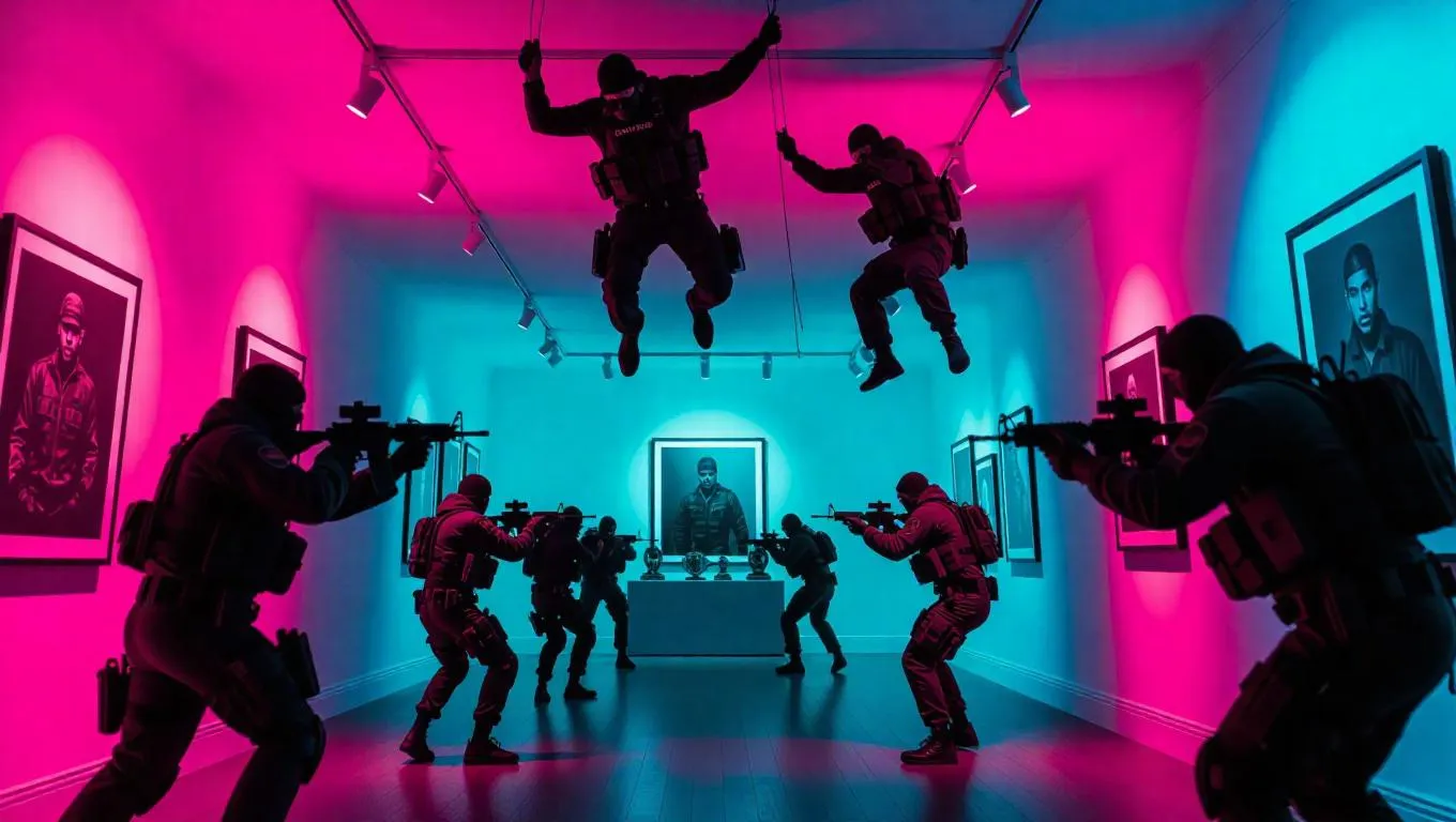 Inside a trendy art gallery in Liberty City, a high-stakes heist unfolds. Thieves, clad in customized outfits, descend from the ceiling using grappling hooks, stealthily stealing priceless antiques. Alarms blare, casting a chaotic turquoise glow, as security guards sprint through the halls, guns raised, to intercept the criminals.