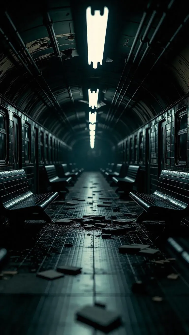 A tense gunfight erupts in an abandoned subway station, with shattered glass and broken benches amplifying the chaos. The scene is framed in a cold, desaturated tone, emphasizing eerie, empty spaces and the echoes of gunfire.
