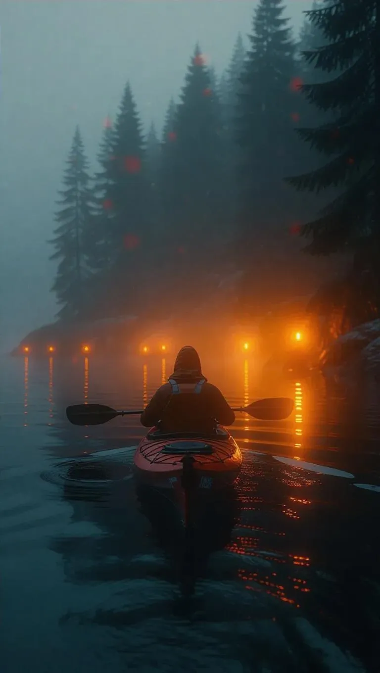 A getaway kayak slips through a fog-bound cove, its crew avoiding marine patrols. The scene is highlighted by the soft flicker of lanterns and the thick fog wrapping the shore.