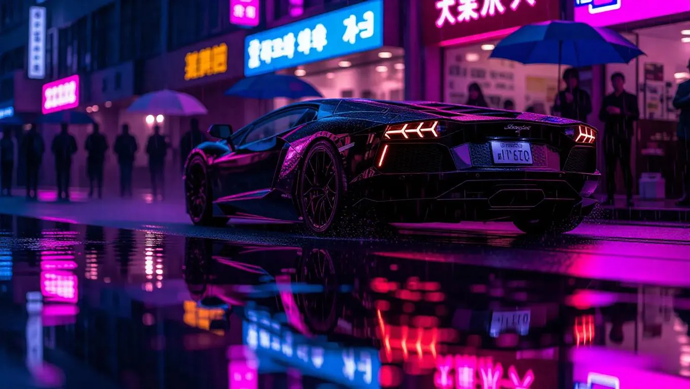 A stolen supercar blasts through a rain-soaked street, its undercarriage reflecting the vibrant neon lights from surrounding shops. Purple and electric blue reflections shimmer on the vehicle's slick surface, mirrored in puddles forming on the asphalt. Nearby, umbrellas bob along as pedestrians scurry to avoid the downpour, while raindrops create a rhythm of their own. The scene resonates with intensity and urgency, captured in close-up angles, glistening wet surfaces, and dynamic flows suggesting speed amidst the storm.