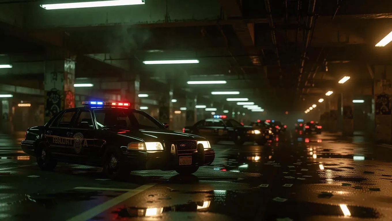 Within a twilight parking garage steeped in shadows and buzzing fluorescents, a surreptitious arms deal unfolds atop oil-streaked concrete. Golden guns glint beneath the light as rival crews assess each other behind dark goggles and fierce face paint. A lone police cruiser prowls outside, its siren glow bleeding through the grated entrance like a heartbeat. Swirling smoke and scattered bills float in slow motion, caught in the heavy silence before chaos. Eerie composition favoring deep hues with bright accents, strong vanishing-point lines drawing focus toward the central exchange.