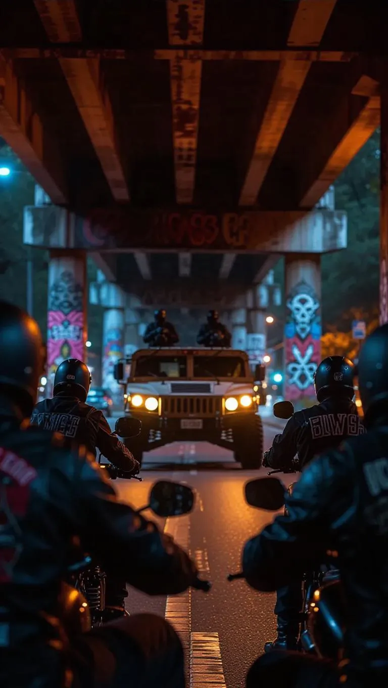 A crew of bikers with face coverings surrounds a stranded armored vehicle beneath a rusty overpass, bright lights creating sharp contrasts, street murals in the backdrop telling tales of courage.