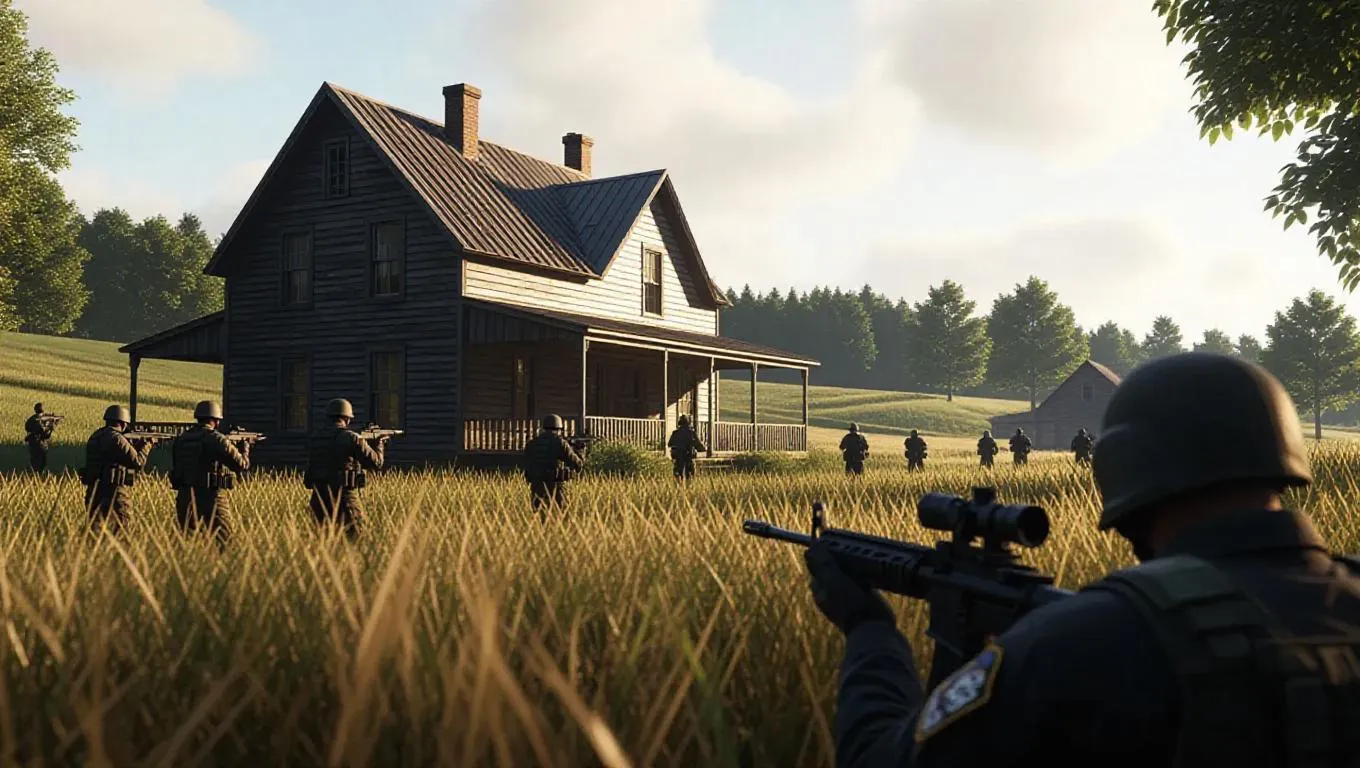 A gang takes hostages in a rural farmhouse, with police snipers in nearby fields. The scene is framed with a tranquil, pastoral tone, highlighting the tension and isolation.