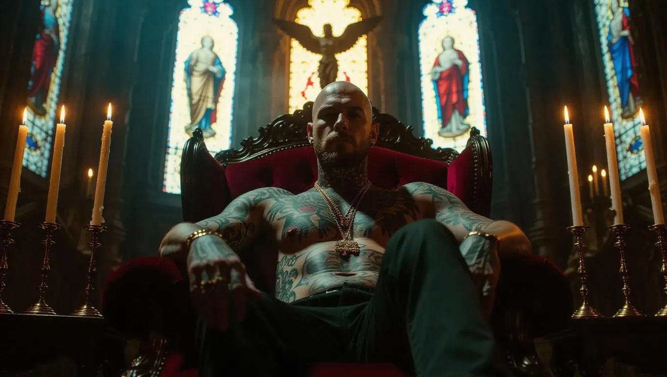 A heavily-tattooed gangster leans against a velvet armchair inside a gothic-style church turned hideout, gold candles flickering beside assault rifles and ancient tomes. A stained-glass angel glows behind him, casting fractured color across his face. Baroque lighting meets street crime with chiaroscuro styling.