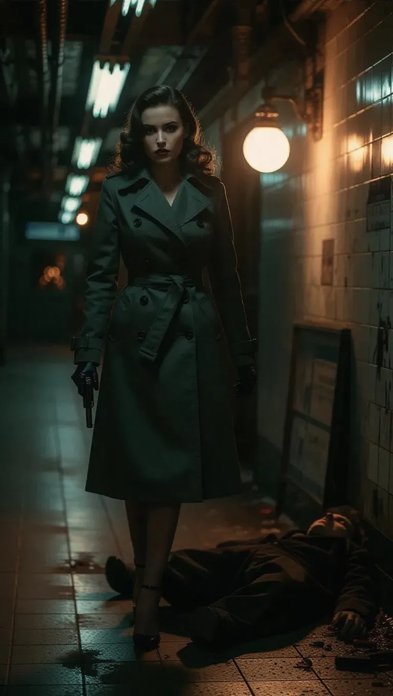 A captivating femme fatale wearing a slate-grey trench coat strides through a desolate subway station, heels clicking against the tiles, revolver drawn. A single flickering bulb illuminates a fallen body lying beside a broken display board. Film noir vibe, high contrast, retro hues.