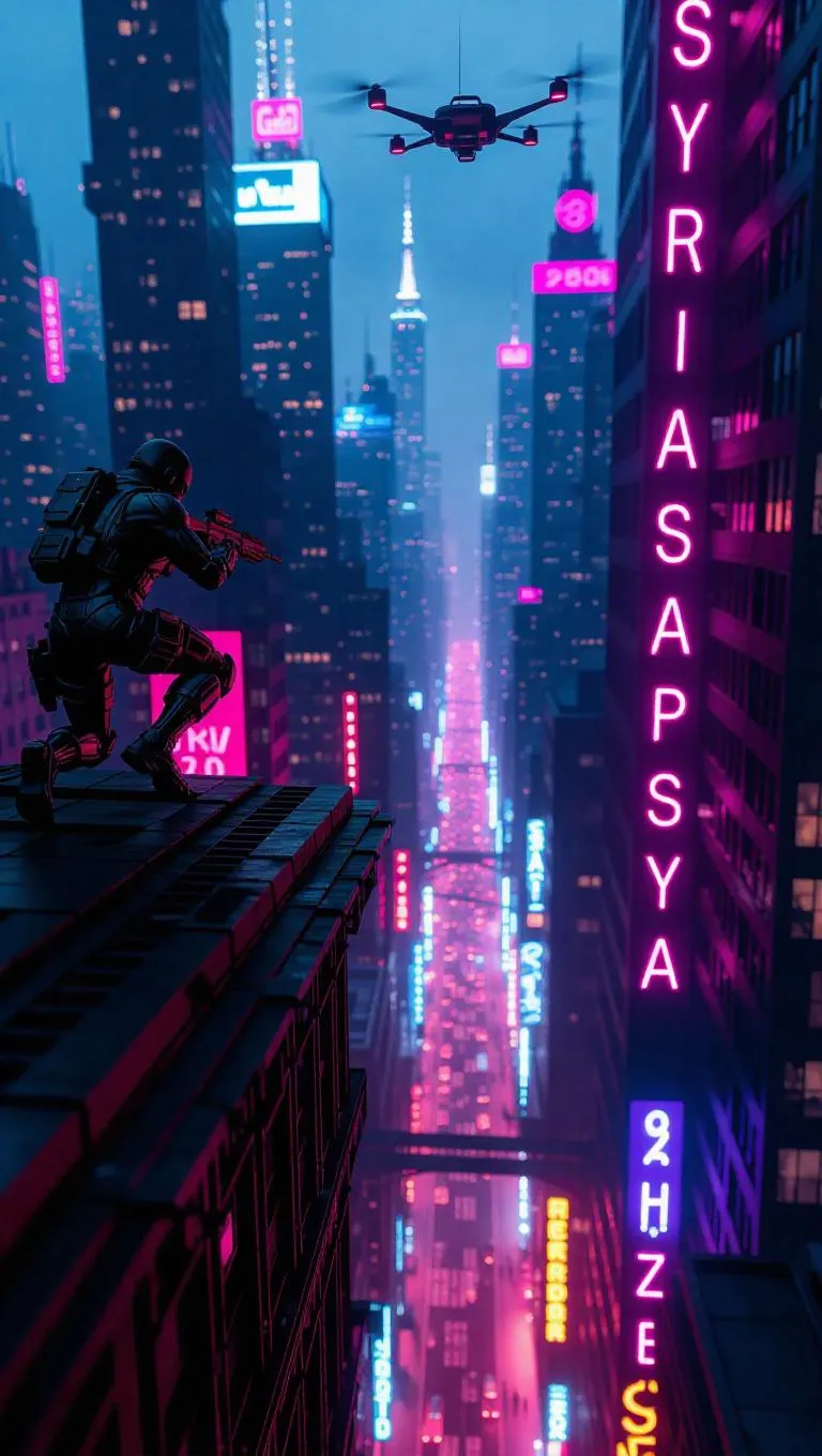 A daring thief vaults across futuristic city rooftops, pursued by relentless cyborgs and hovering drones. The skyline glows with holographic ads and neon lights, creating a vibrant, chaotic atmosphere.