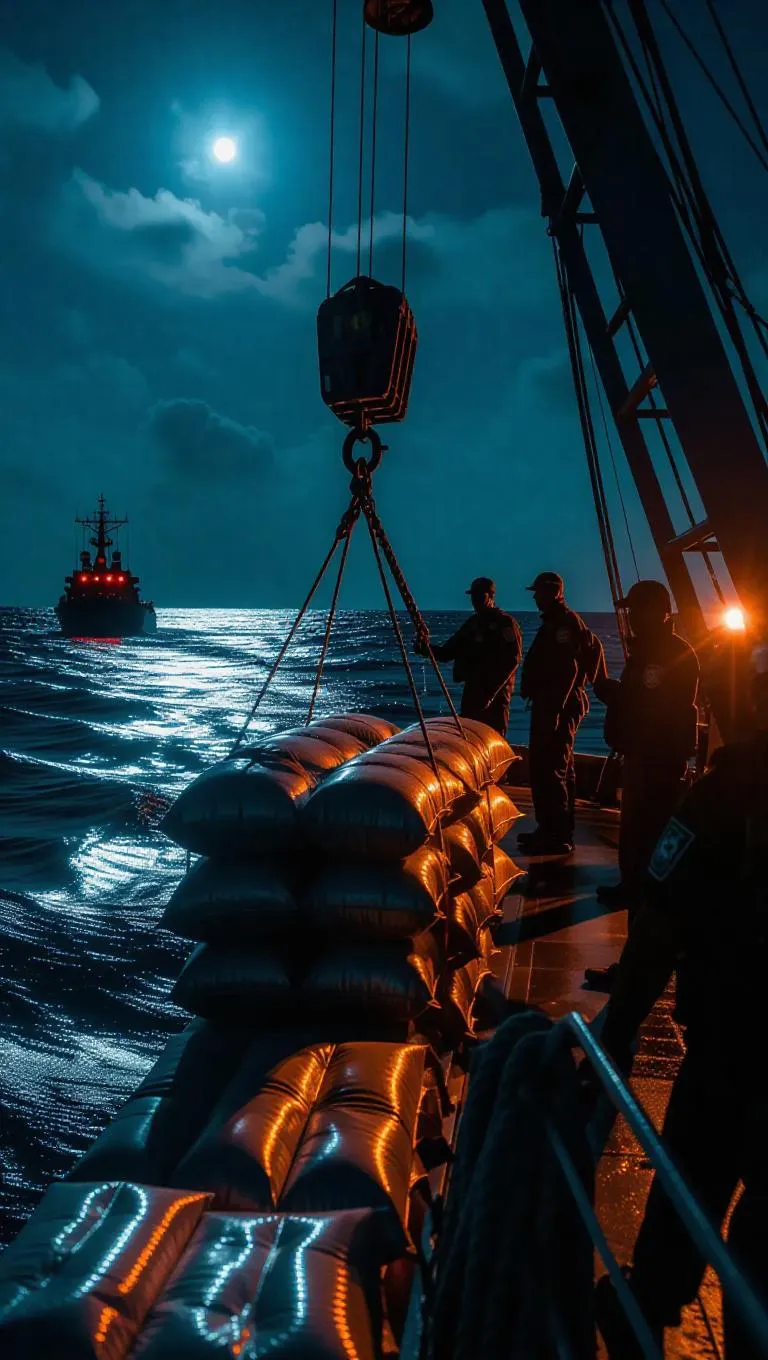 A team of smugglers employs a hoist to raise a cargo box filled with illicit substances. Naval vessels draw near, their sirens blaring across the waves. The scene is bathed in the dim light of moonlit skies.