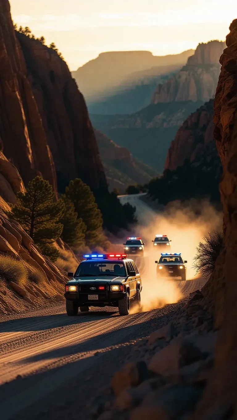 A vintage off-road vehicle tears down a narrow mountain road, kicking up dust and gravel. Police SUVs follow closely, their sirens echoing through the canyon. The scene is framed with dramatic cliffs and a vibrant sunset, emphasizing the high-stakes escape.