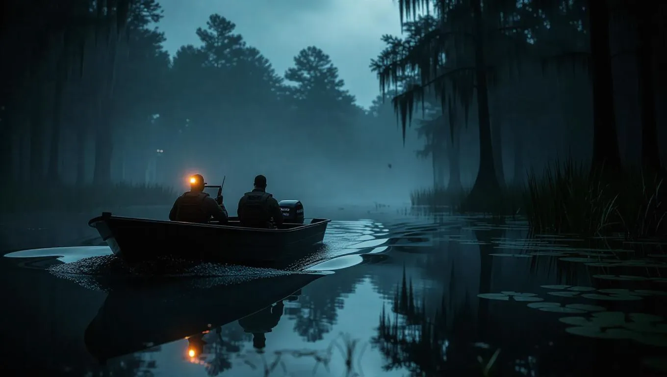 A getaway boat zooms across a murky swamp, its crew avoiding the local wildlife rescue team. The environment is lit with the ominous light of will-o'-the-wisps and the eerie fog hanging low.