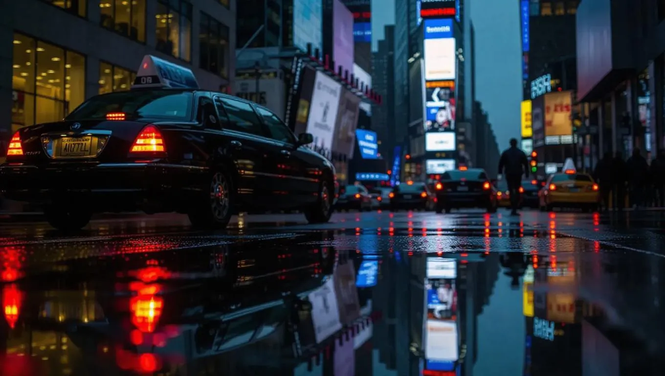 A lone sniper perches on a skyscraper ledge, overlooking a rain-soaked city street. Their target, a tech mogul, exits a sleek limousine. The composition highlights the reflections in the puddles and the sniper's meticulous preparation.
