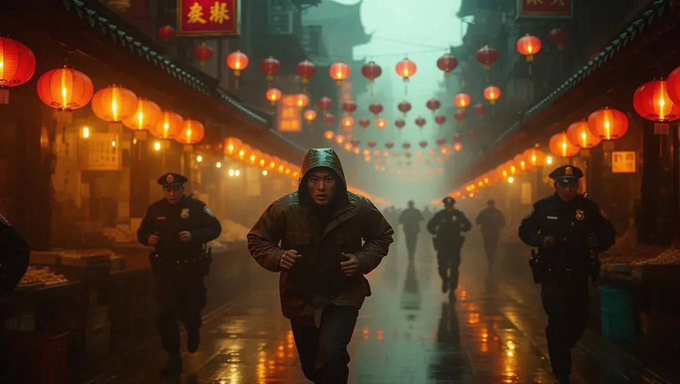 A fugitive in a battered jacket sprints through a foggy Chinatown market, neon signs reflecting dully behind him, as police officers chase close behind. Lanterns flicker ominously above. Aerial drone view with dramatic depth and environmental storytelling.