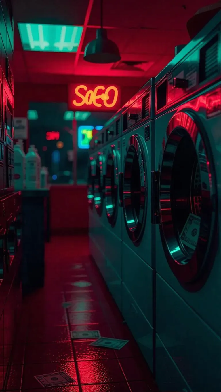 A secretive money laundering zone in a contemporary laundromat, where dryer doors spin with money instead of clothes. Underworld figures weigh bills next to bottles of bleach and mid-century arcade games. Surreal realism with bold graphic color grading.