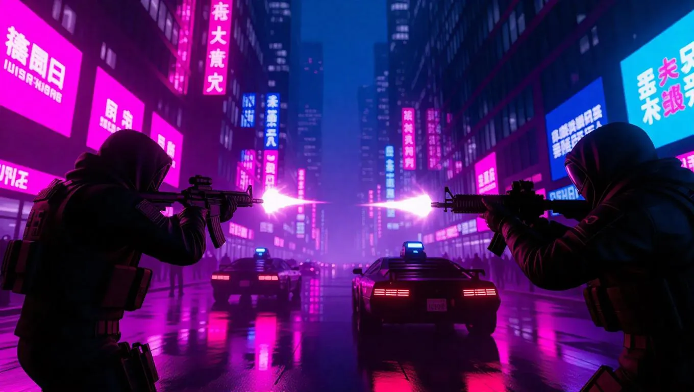 Two rival gangs confront each other in a futuristic cityscape, weapons clashing and echoing off the glass skyscrapers. Neon lights and hover cars enhance the chaotic atmosphere. The scene is captured with a vibrant, cyberpunk palette, emphasizing tension and danger.