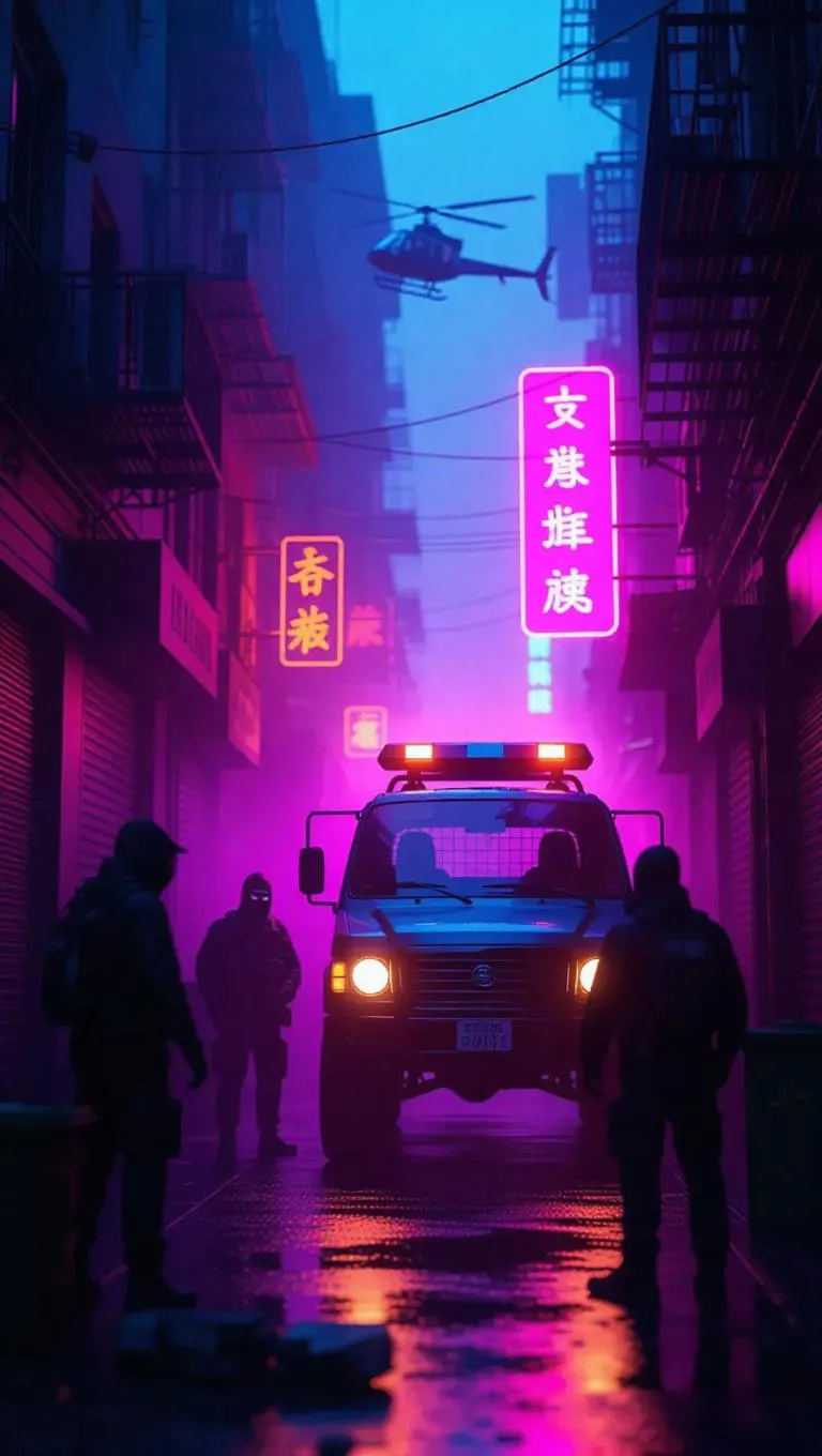 In a brightly lit alleyway, a crew of masked thieves huddle around a stolen armored van, its engine still warm. Neon signs flicker above, casting a mix of purple and orange hues over their tense faces. A police chopper circles in the distance, its spotlight piercing the fog. Soft rounded lines and a pastel palette emphasize the gritty urban setting.