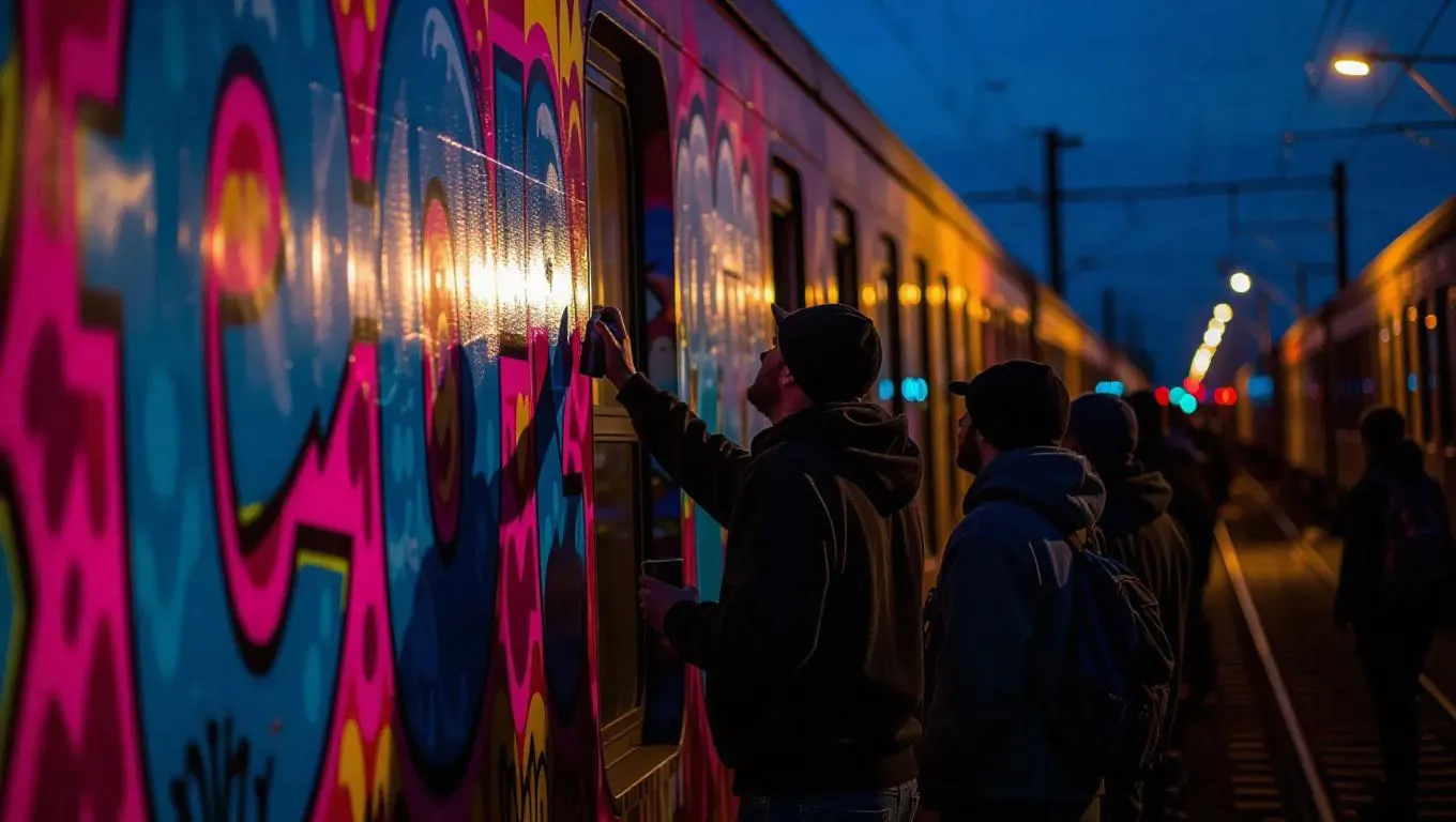 A group of taggers is spray-painting a creative mural on a train car, their shadows illuminated by a nearby streetlight. The sound of distant police sirens buzzes, indicating the urgency of their situation. The visual presents a lively urban environment wrapped in a vivid color scheme.