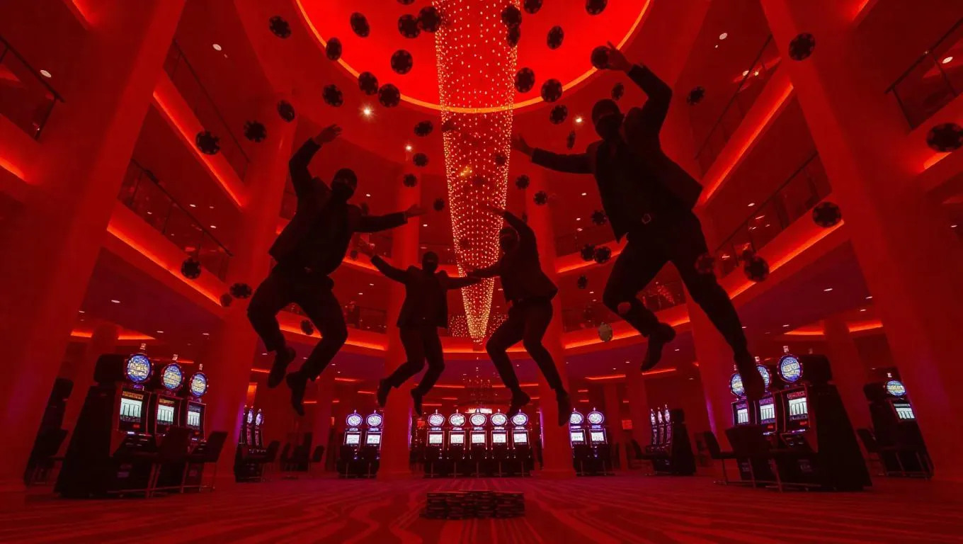 A dramatic casino heist in progress, nimble robbers vaulting over barriers in a grand atrium, glittering chips and money caught midair in slow motion. Giant inflatable sculptures and bamboo carpets contrast the chaos. Dynamic tilt-up camera movement, freeze-frame intensity with deep red lighting.