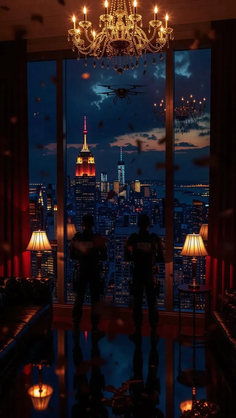A luxury penthouse blazes with siren light as elite assault units breach the glass walls, breathing heavily, catching the reflection of a crime boss mid-smirk. Crystal chandeliers shatter midair, frozen in a ballet of chaos, while the skyline burns with nightlife neon. Velvet drapes twist in the wind from the broken balcony, revealing an observation drone hovering between skyscrapers. Dynamic interior-exterior contrast with cinematic lens flare and high-saturation lighting.