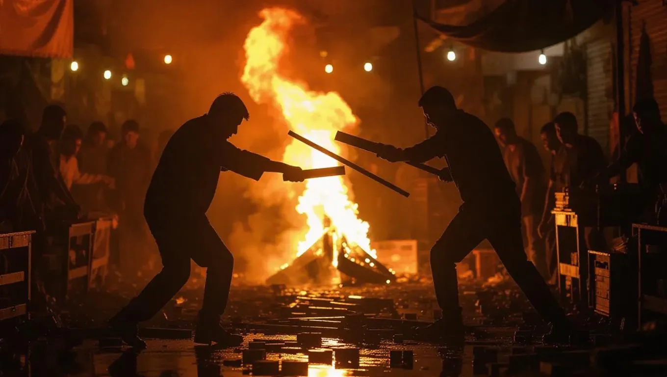 Two rival gangs clash in a bustling marketplace, using scraps of wood and market stalls as weapons, the scene illuminated by the warm, flickering glow of burning tires, creating a chaotic, gritty, and intense atmosphere.
