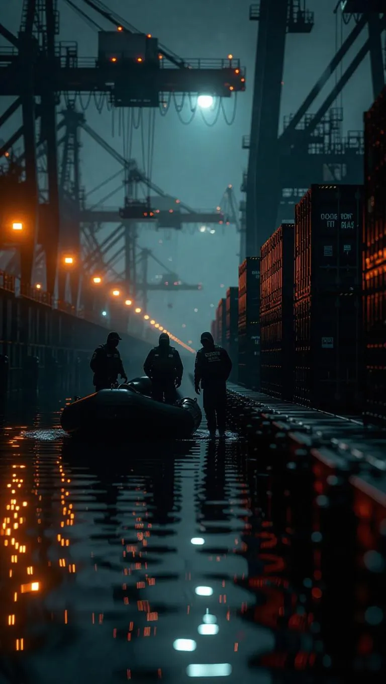 A moonlit dockyard echoes with distant sirens as masked brigands offload crates into an inflatable boat bobbing beside slippery pilings. Shipping containers loom like giants, each tagged with gang emblems and dirty fingerprints. Overhead, a crane’s halogen floodlight throws the figures into harsh relief against the harbor mist. Beyond the chain-link fence, flashing beacons cut through the twilight, their reflections rippling in slick puddles. Tight medium shot capturing glistening tension and stark shadows, with rough metal textures and atmospheric framing.