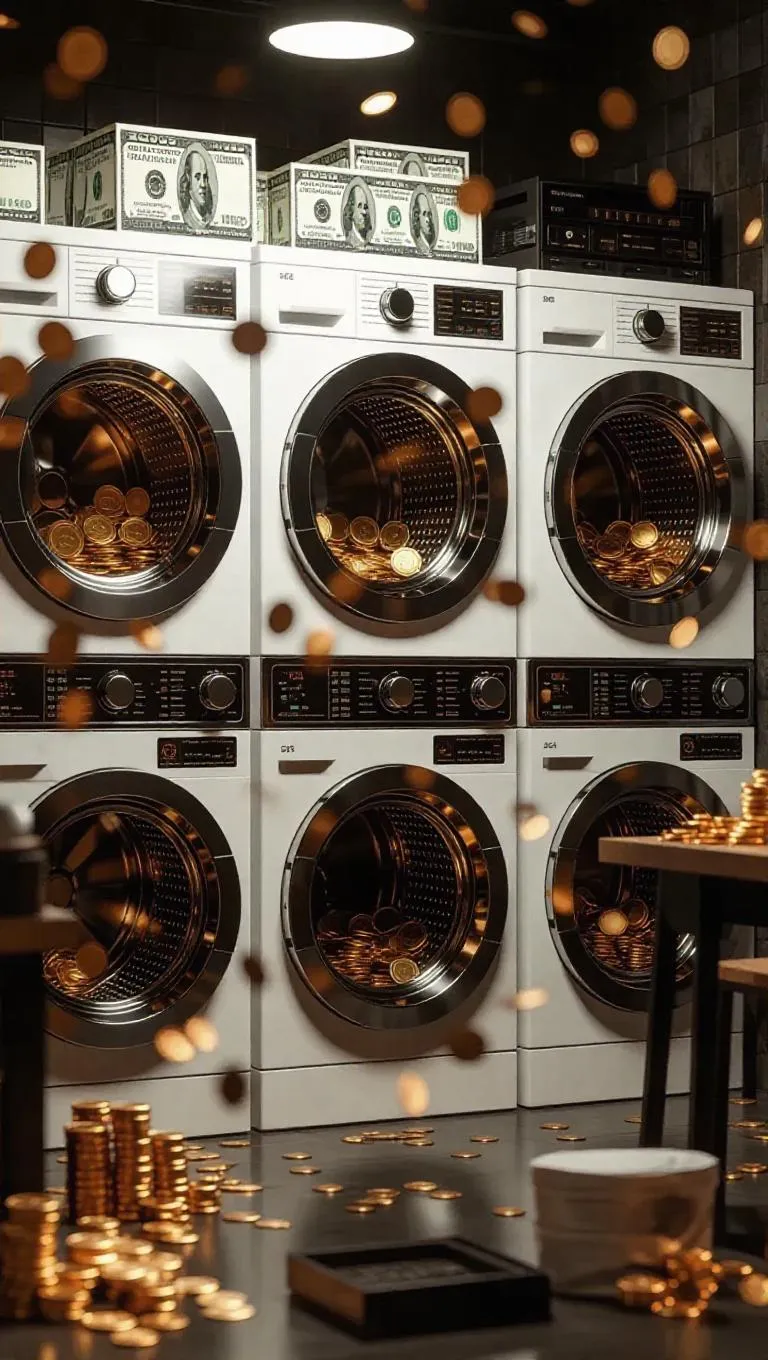 A clandestine laundering room in a modern laundromat, where dryer doors spin with gold coins instead of clothes. Criminals handle large bills beside soap pods and vintage gaming consoles. Surreal realism with striking color contrast.