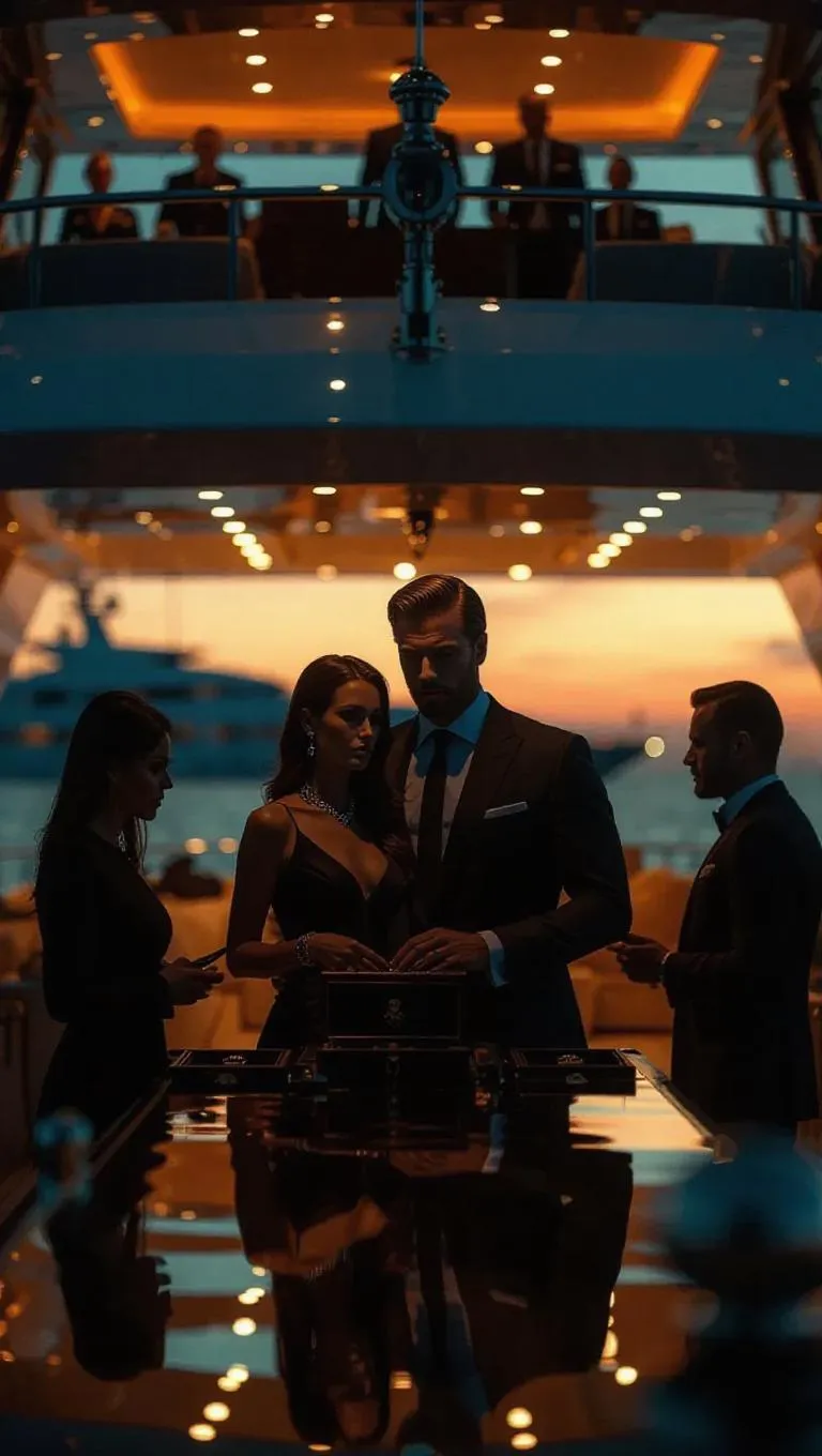 A clandestine meeting unfolds on a luxury yacht bathed in soft twilight, where elegantly dressed negotiators flanked by armed guards exchange jewelry cases. Below, the city breathes in soft waves, and a sniper scope glints in the dark. Long-lens compression with cinematic bokeh, stylized atmospheric haze.