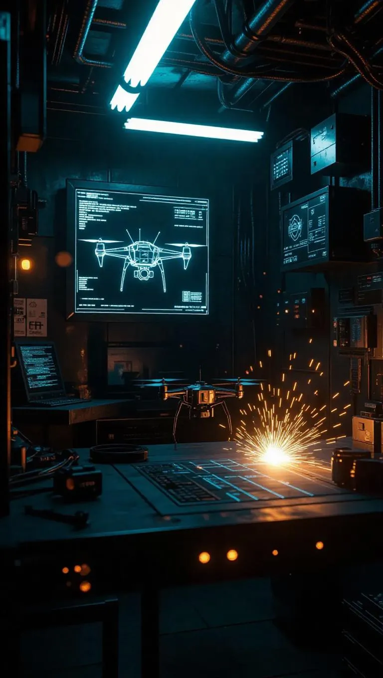 A backstreet facility crackles with welding sparks, where drones are rebuilt for smuggling. Holographic blueprints flicker on cracked screens, and chrome shines under flickering fluorescent tubes. Gritty cyber-crime aesthetic with oily reflections and heat distortion.