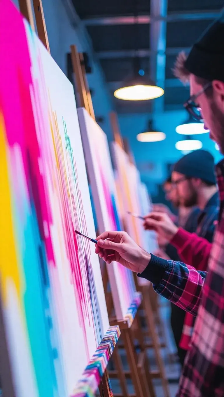 A group of hackers in an art studio surrounded by canvases and easels, uploading a virus as paint splashes reflect code across their faces. Creative cyber-thriller vibe with colorful lighting and artistic focus.