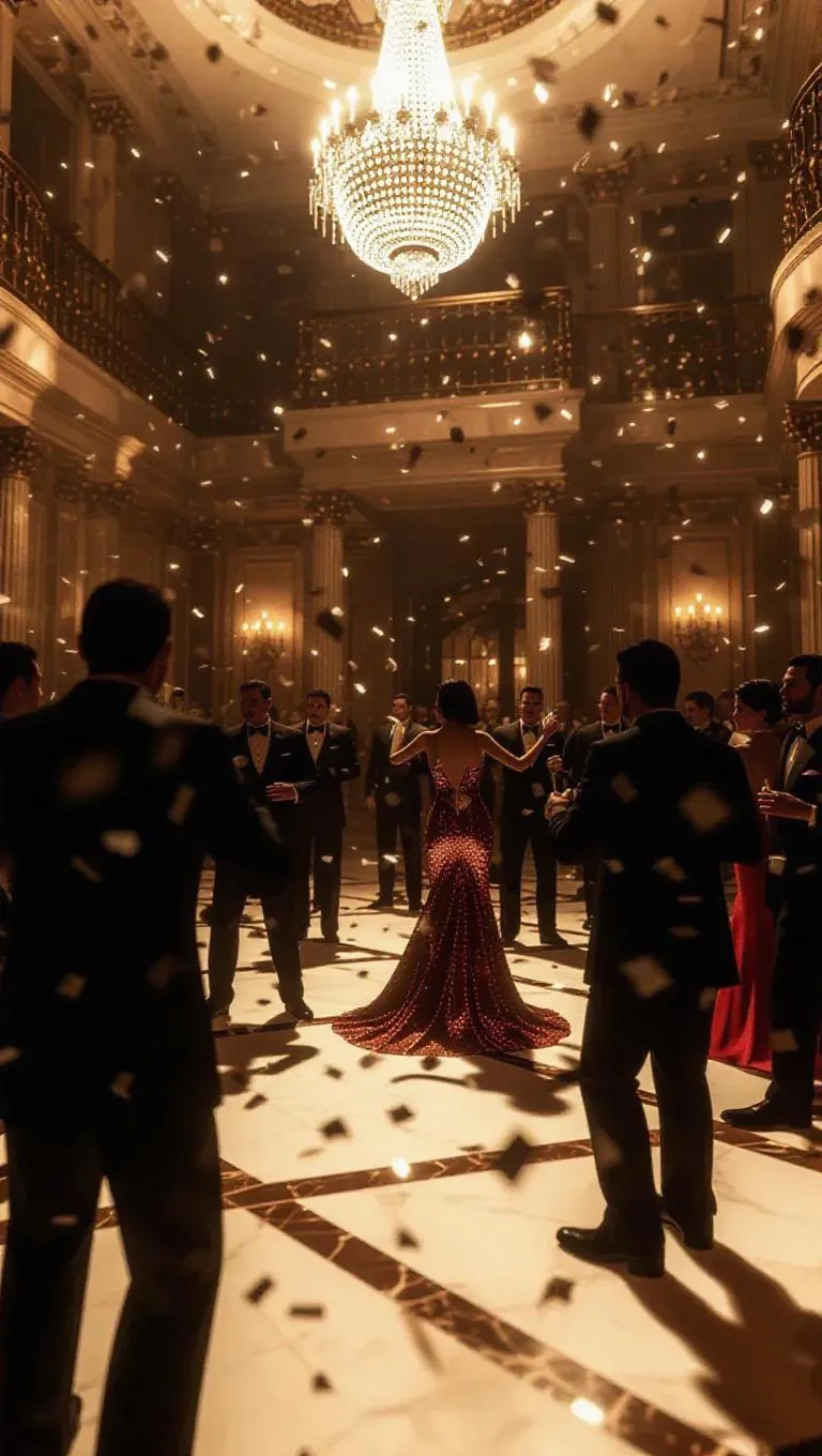 In a lavish penthouse in Vice City, a glamorous party erupts into chaos. Hitmen storm the room, unleashing a hail of bullets. Socialites in opulent gowns and tuxedos frantically seek shelter, while shards of the shattered chandelier glint like diamonds on the polished marble floor.