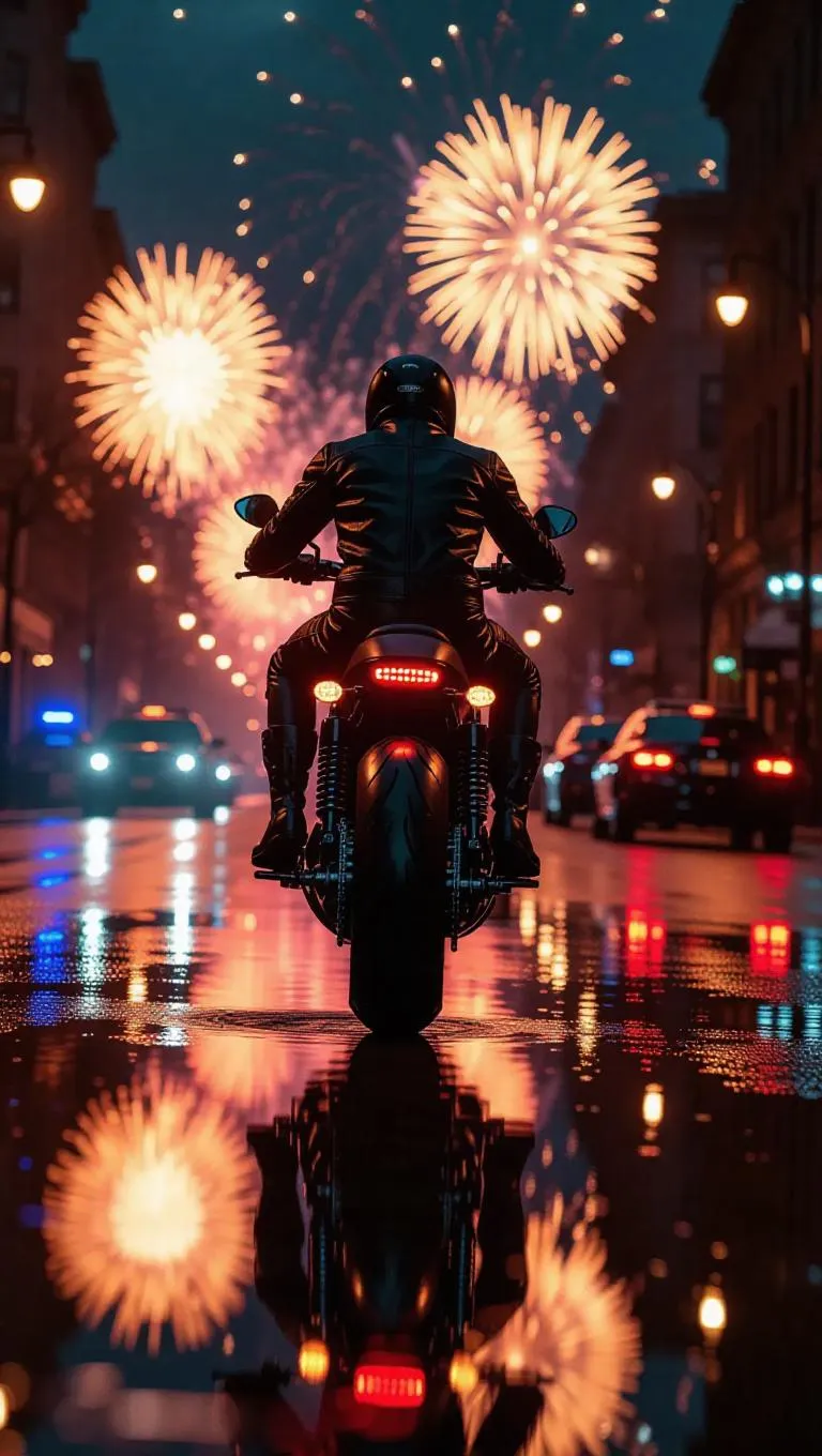 A lone motorcyclist in a black leather jacket zooms down an empty boulevard, backlit by exploding fireworks and flickering street lamps. Digital reflections shimmer across puddles, and behind him, a chain of patrol cars twist through city shadows. Motion-capture angle from below, sparks trailing from the tailpipe, dramatic shallow depth of field.