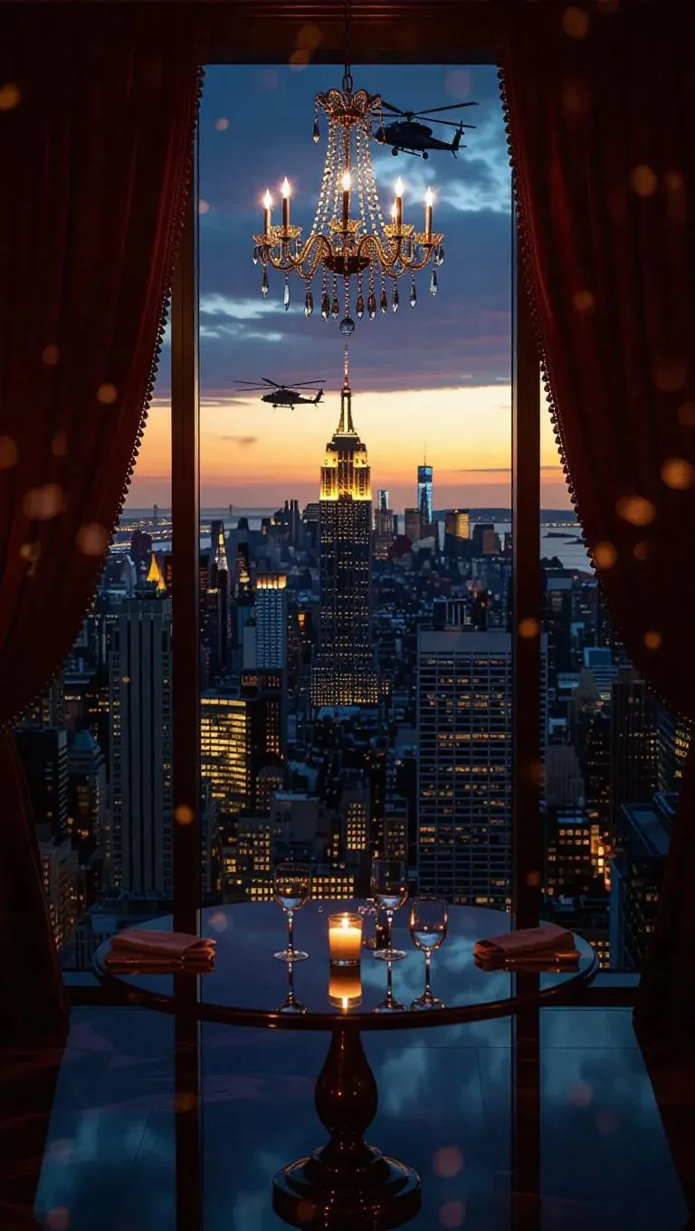 A luxury penthouse blazes with siren light as elite SWAT units breach the glass walls, rifles raised, catching the reflection of a crime boss mid-toast. Crystal chandeliers shatter midair, frozen in a ballet of chaos, while the skyline burns with nightlife neon. Velvet drapes twist in the wind from the broken balcony, revealing a gunship hovering between skyscrapers. Dynamic interior-exterior contrast with cinematic lens flare and high-saturation lighting.