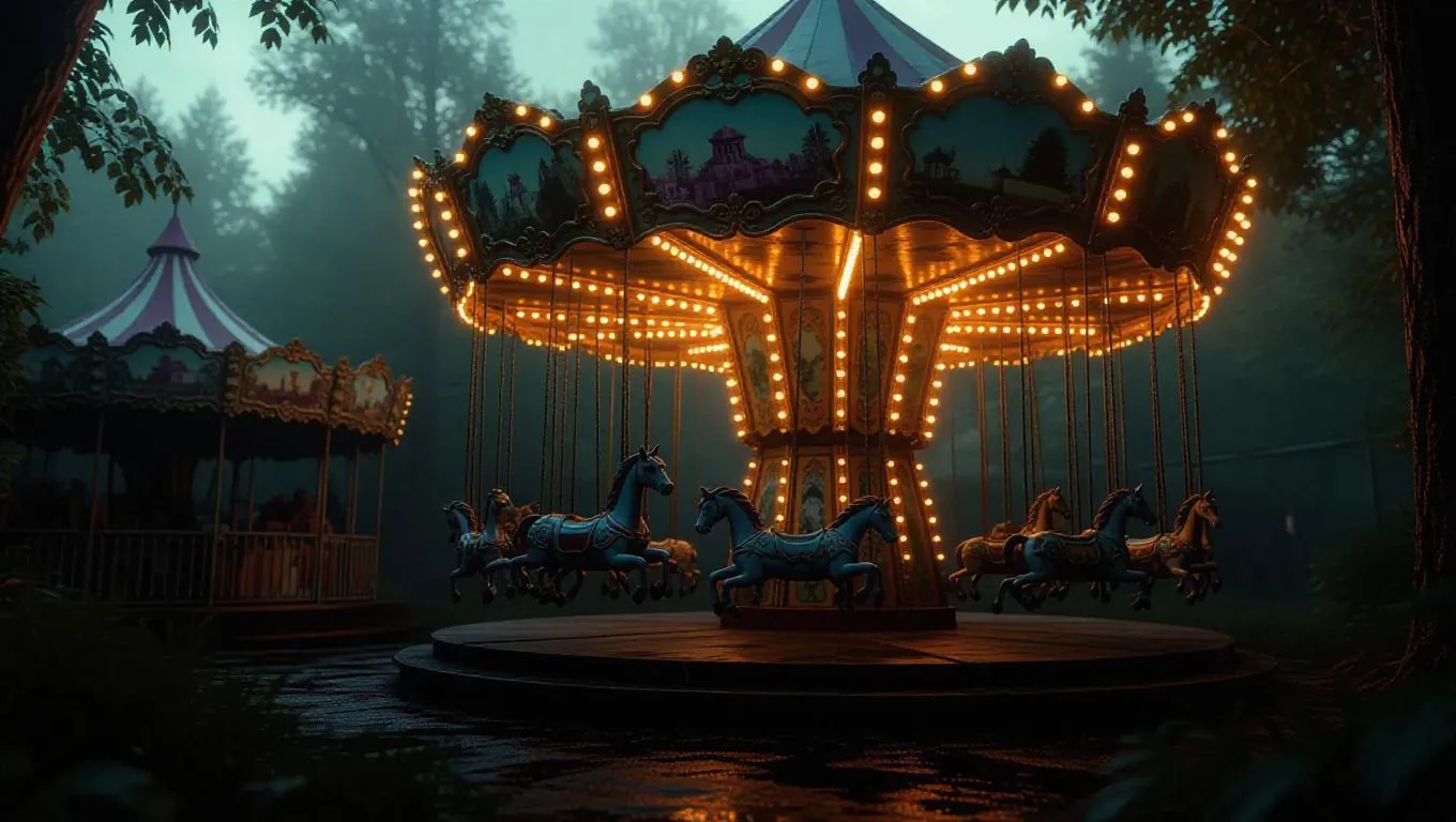A derelict amusement park overtaken by mutated creatures, with broken structures turned into nests. A carousel spins slowly with flickering lights, abandoned and grotesque. Surreal post-apocalypse vibe with thick, wild overgrowth.