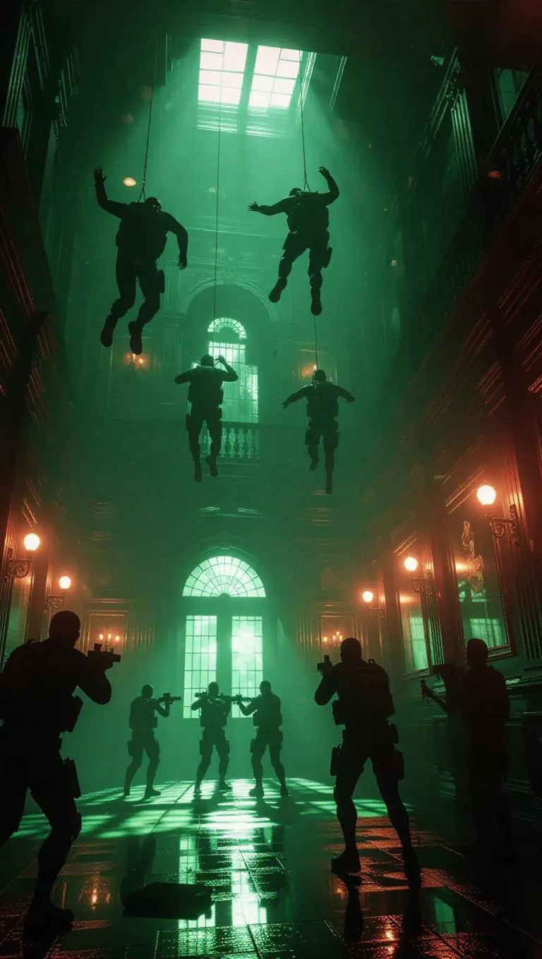 Inside a trendy art gallery in Liberty City, a high-stakes heist unfolds. Thieves, clad in punk outfits, dive from the ceiling using harnesses, stealthily stealing priceless pieces. Alarms blare, casting a chaotic sea green glow, as security guards sprint through the halls, guns pointed, to intercept the criminals.