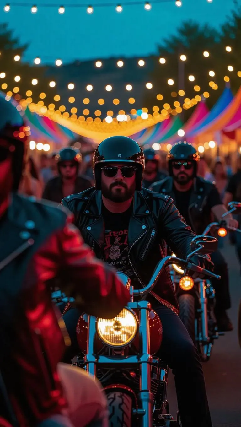 A biker gang weaves through a bustling festival, leather jackets swirling in the excitement. Up ahead, a rival gang blends into the crowd, weapons glinting in the festive lights. Tension fills the air, captured with lively movement and a colorful, vibrant palette.