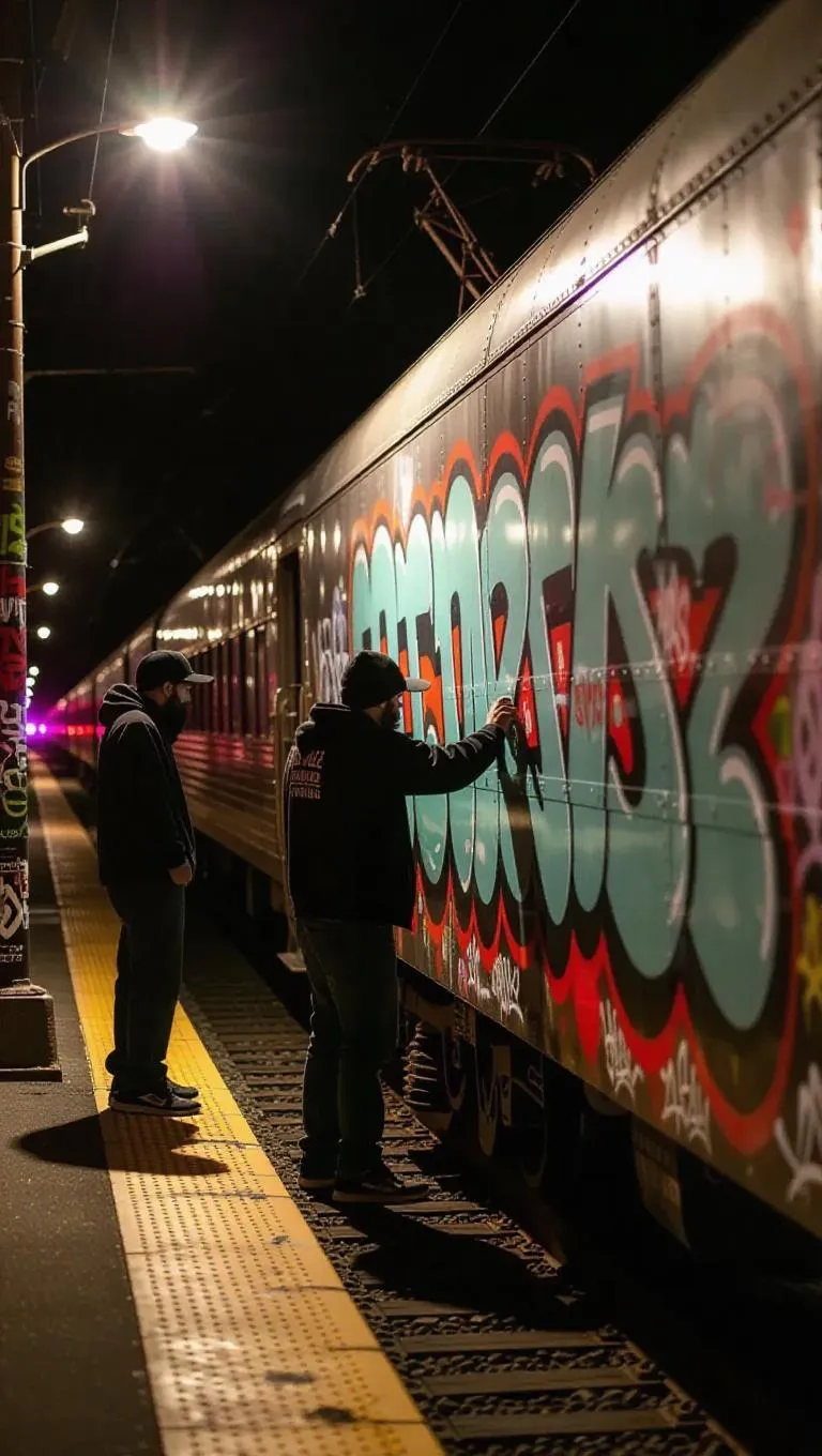 Several graffiti artists are spray-painting an intricate mural on a train car, highlighted by the soft light of a nearby streetlamp. The distant sound of police sirens hints at their looming exit. The backdrop presents a striking urban aesthetic in a muted color environment.