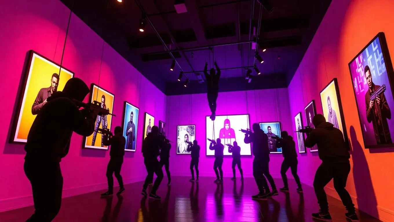 Inside a trendy art gallery in Liberty City, a high-stakes heist unfolds. Thieves, clad in casual hoodies, descend from the ceiling using ropes, stealthily stealing priceless collectibles. Alarms blare, casting a chaotic chartreuse glow, as security guards sprint through the halls, guns aimed, to intercept the criminals.