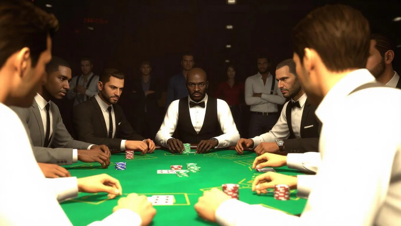 In a dimly-lit underground casino in Liberty City, a tense high-stakes poker game is abruptly interrupted by a mysterious stranger. Tables overturn, eyes scatter, and players exchange whispers, the room erupting into chaos as they prepare to confront the newcomer.