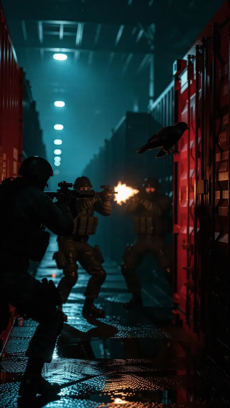 A crew of mercenaries ambushes a gang in a remote loading dock, their weapons glinting in the flickering light, echoes reverberating off the shipping containers. A distant hoot of an owl breaks the silence, adding to the tension. The scene is captured with a gritty, urban aesthetic, emphasizing the raw energy and danger.
