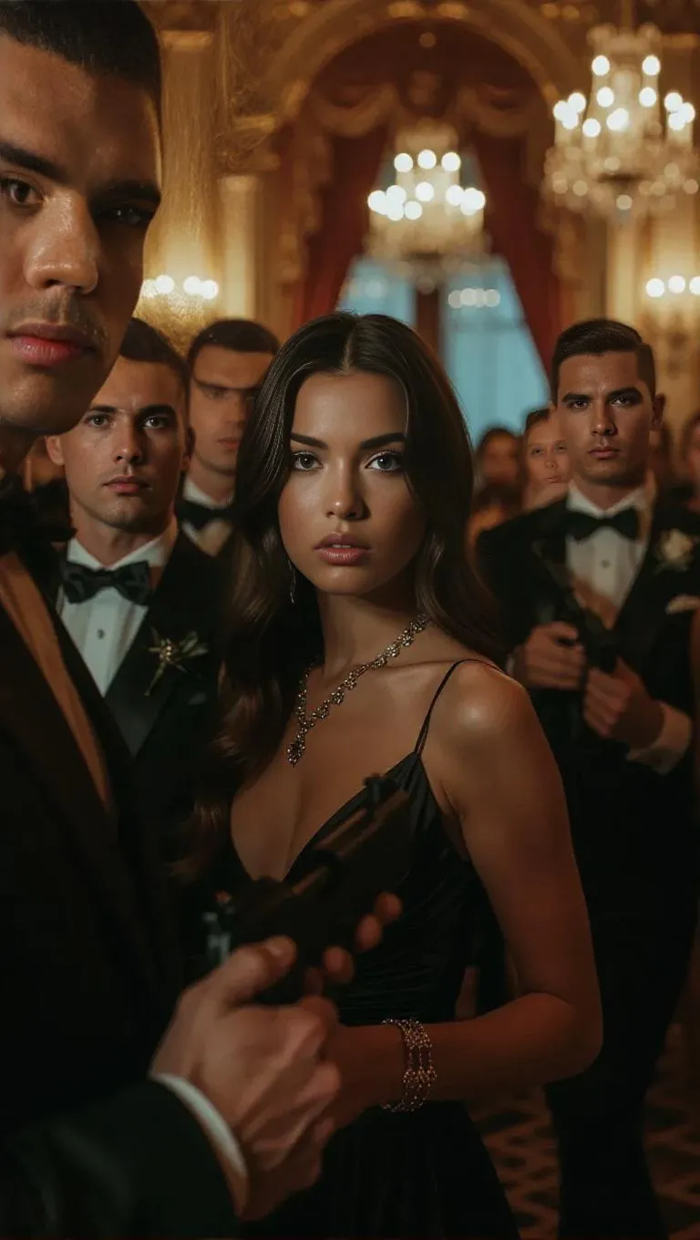 A gang takes hostages in a glamorous gala, with police snipers hiding among the guests. The scene is framed with an elegant, sophisticated tone, contrasting the tension and isolation.