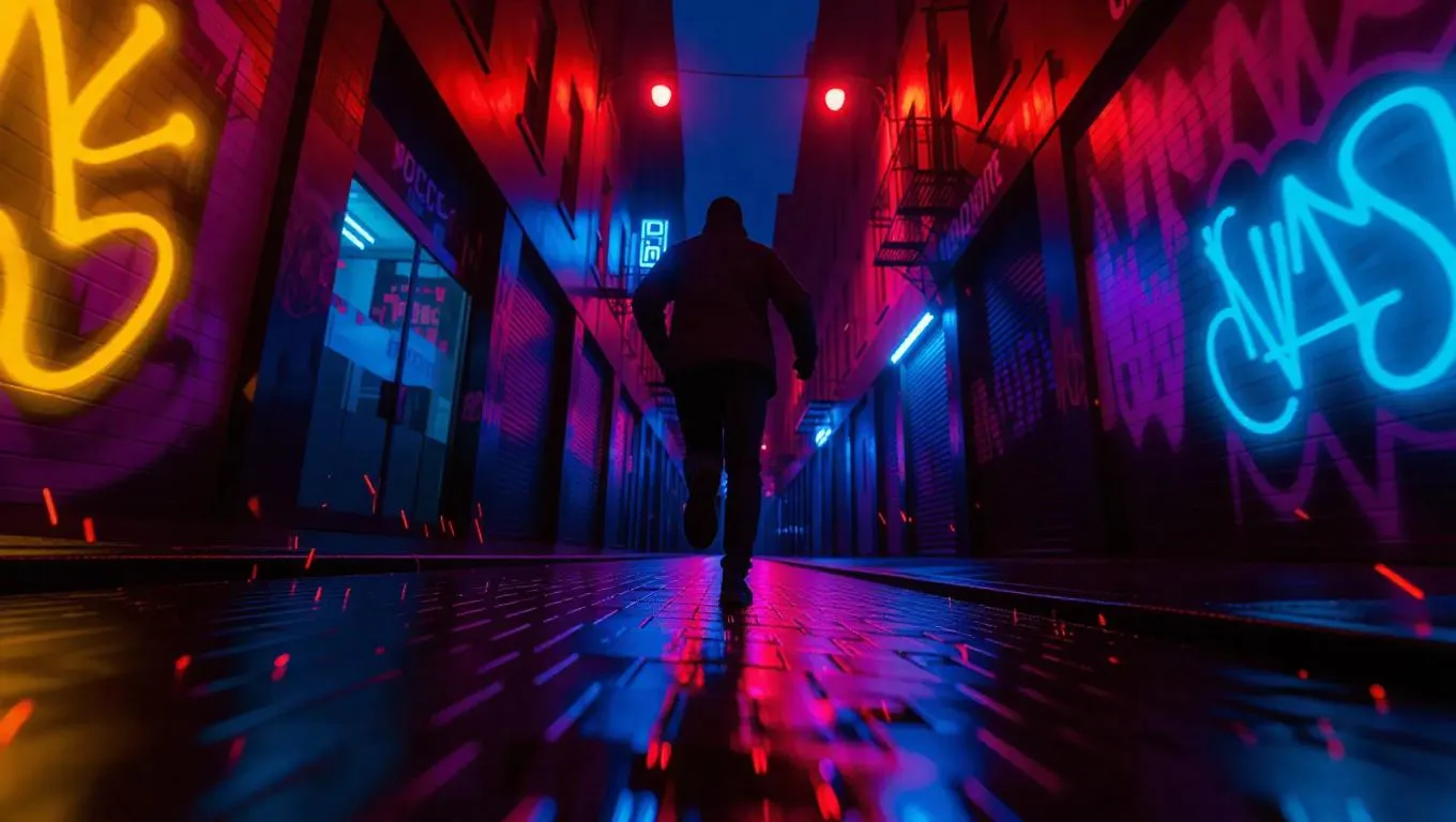 A dynamic pursuit through neon-lit streets at midnight, police boots echoing through alleys behind a frantic runner dashing past buildings. Sparks fly from streetlamps, bathing the vibrant graffiti in electric colors that blend with the night. Close-cropped angle, blending motion blur, neon color clash.
