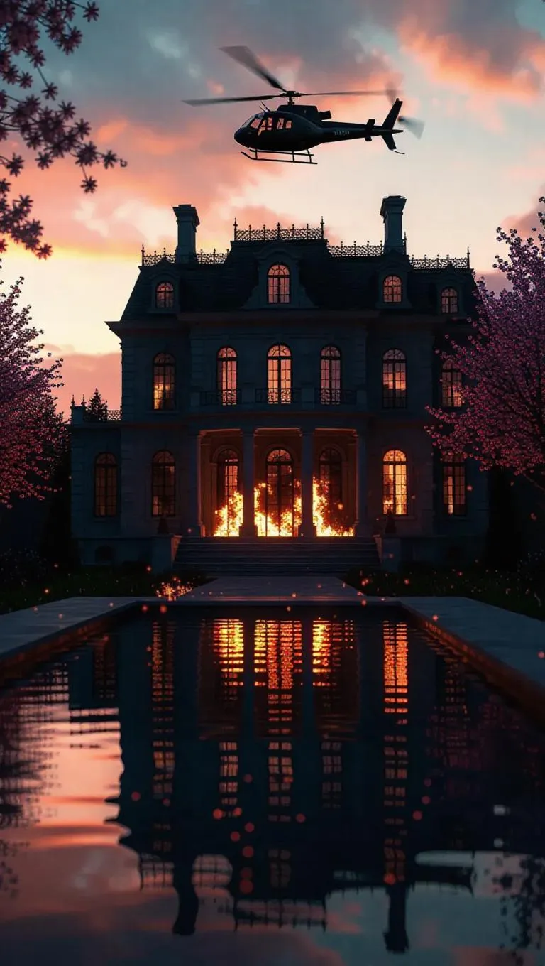A booby-trapped mansion explodes in the countryside, fireballs silhouetting cherry blossom trees, as a helicopter escapes into the evening sky. Infinity pool reflects both fire and fireflies. Epic wide shot with deep layering and orange-teal blockbuster palette.
