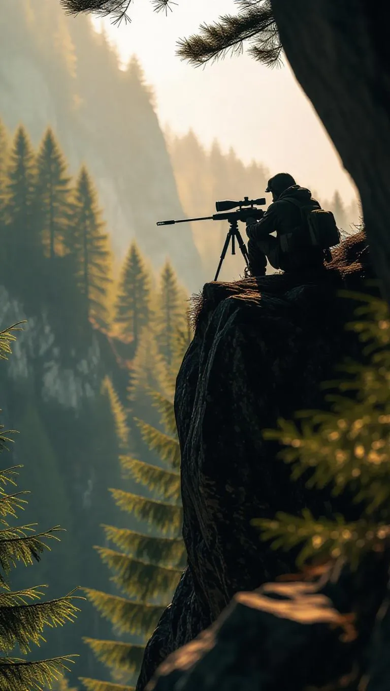 A lone sniper perches on a mountain cliff, overlooking a quiet forest below. Their target, a secret agent, emerges from a hidden bunker. The composition highlights the tranquil, sun-dappled woods and the sniper's focused concentration.
