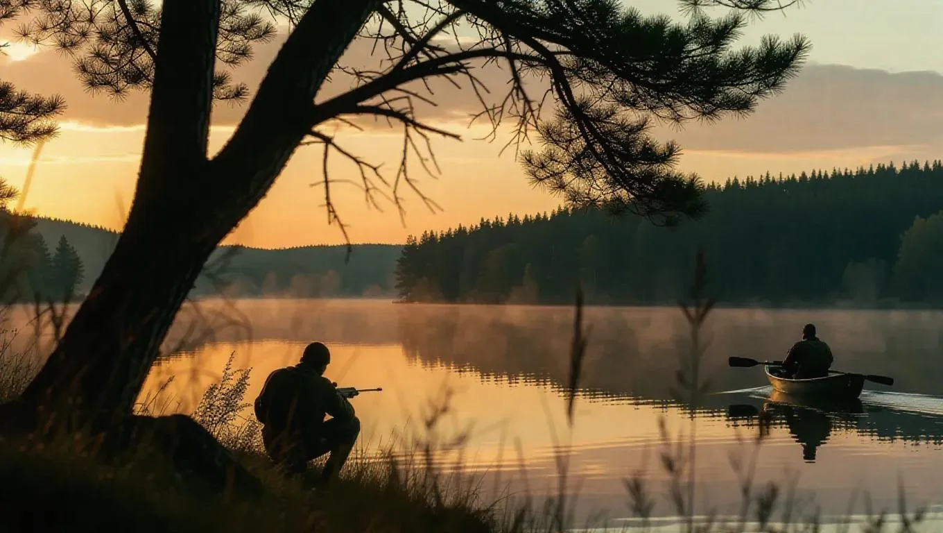 A lone sniper crouches in the branches of a large tree, overlooking a serene lake at dawn. Their target, an environmental activist, rows a boat. The composition highlights the tranquility of nature and the sniper's contemplative state.
