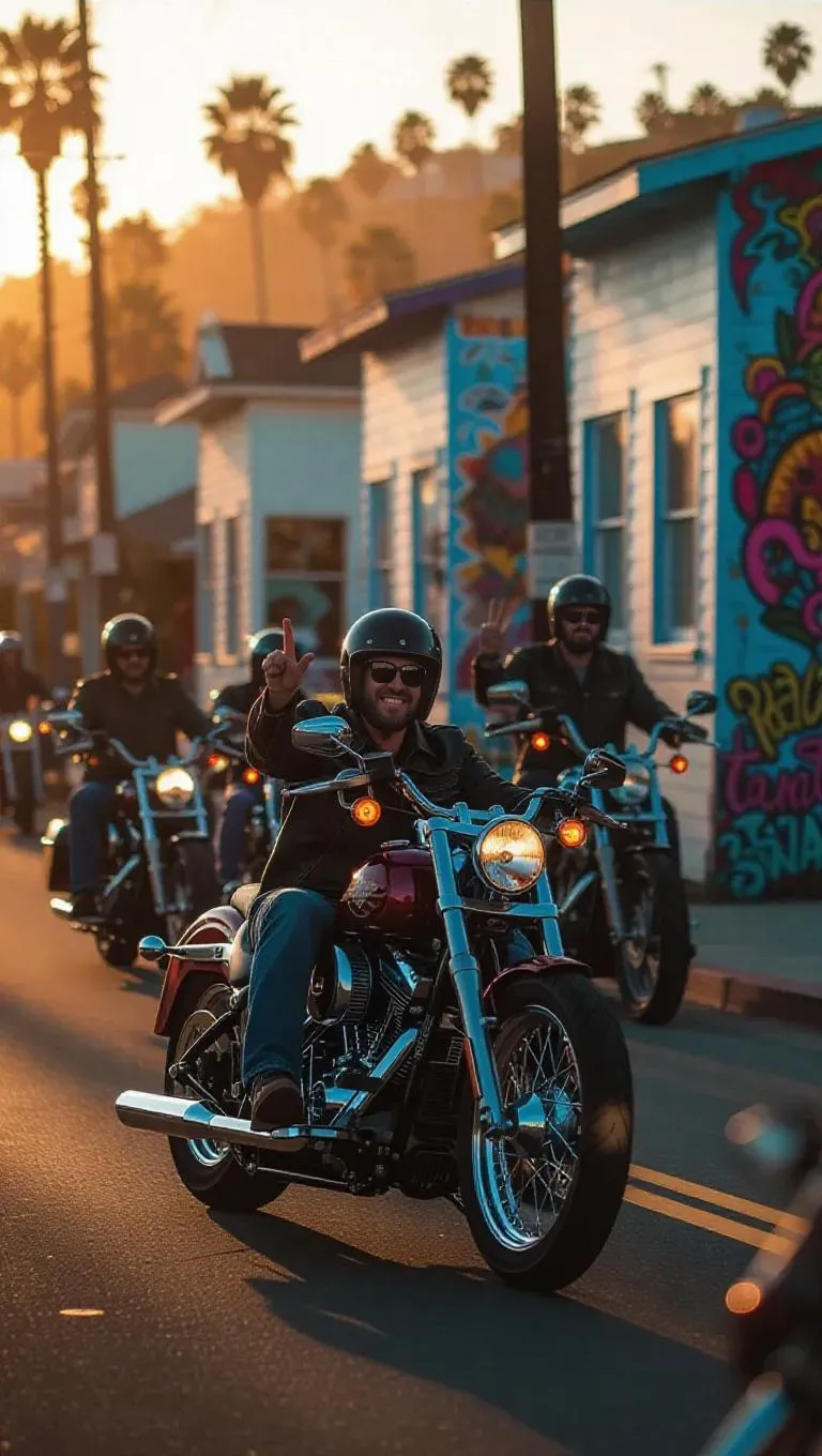 A custom motorcycle cruisers along a coastal highway at golden hour, with bikers giving peace signs. Artful murals of surf culture decorate the seaside buildings, while reggae music and distant laughter fill the air. Bright tones with tropical color grading and lens flares.