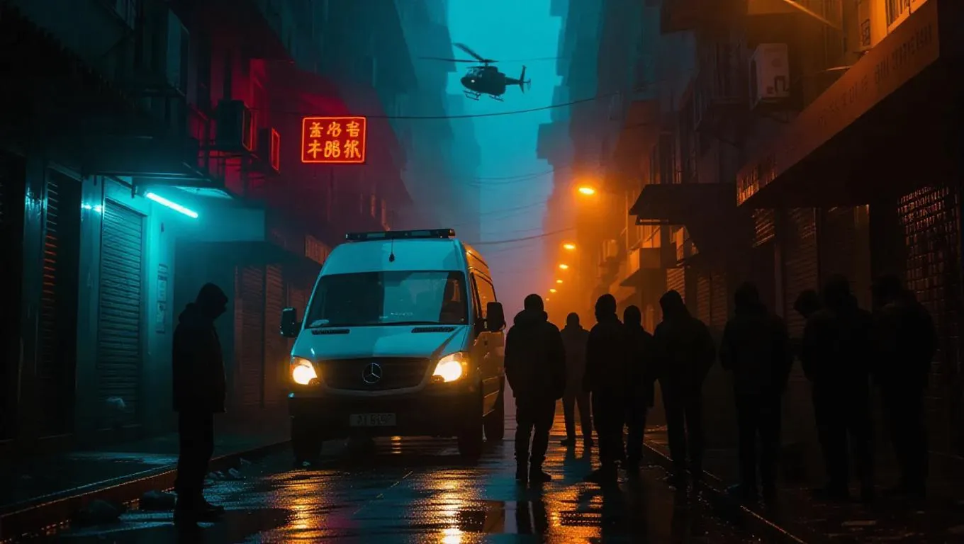 In a dimly lit alleyway, a crew of thieves in disguises huddle around a stolen armored van, its engine still warm. Neon signs flicker above, casting a mix of orange and white hues over their tense faces. A police chopper circles in the distance, its spotlight piercing the fog. Strong vertical lines and a rustic color palette emphasize the gritty urban setting.