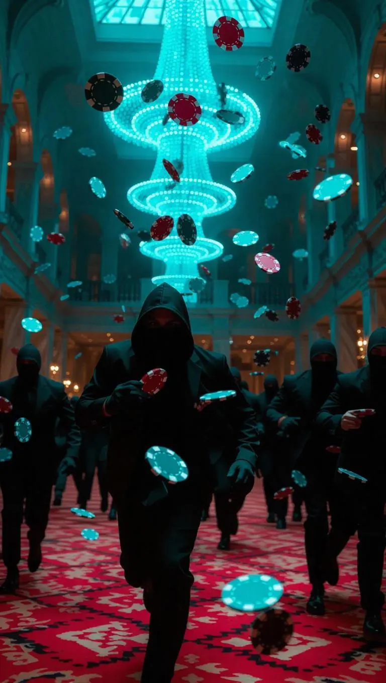 A dramatic casino heist in progress, masked bandits running through a grand atrium, glittering chips and money caught midair in slow motion. Giant abstract sculptures and knitted carpets contrast the chaos. Dynamic pan-down camera action, freeze-frame intensity with turquoise lighting.